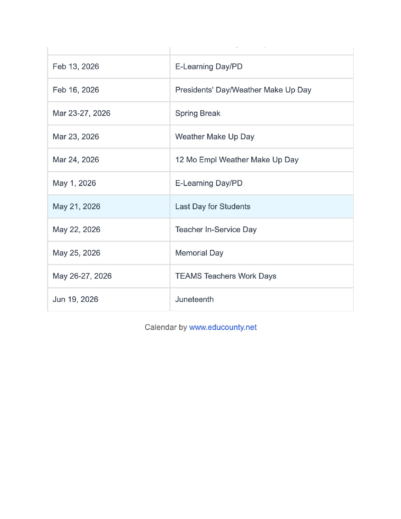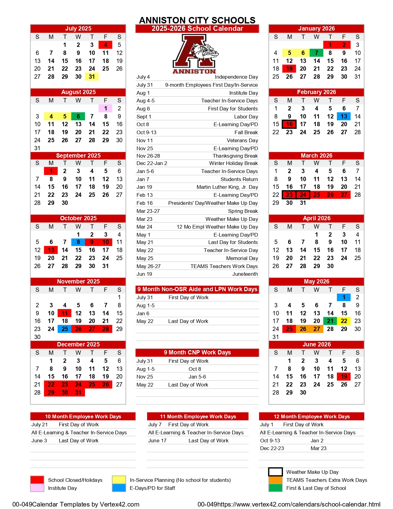 Anniston City Schools Holidays Calendar 2025-2026